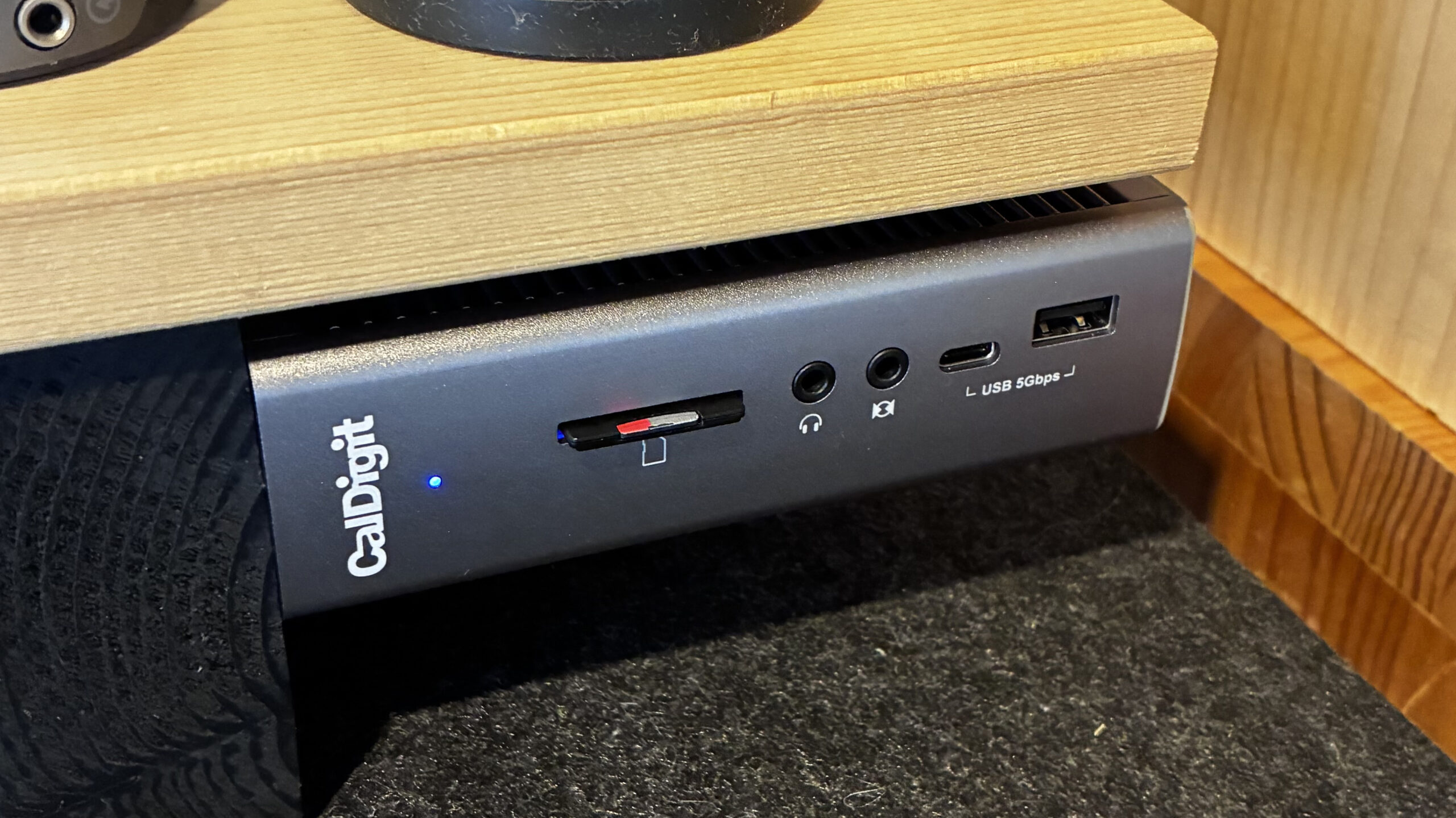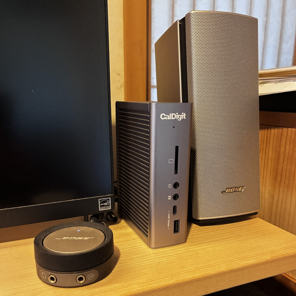 そうなると足らないポート類。それを補うために「CalDigit TS3 Plus+ Thunderbolt ドッキングステーション」を中古で購入しました。このモデルはThunderbolt3にまで対応しており、最新のThunderbolt5と比べるとだいぶ型落ちの規格ですが個人的に十分であります。値段も安いですし。