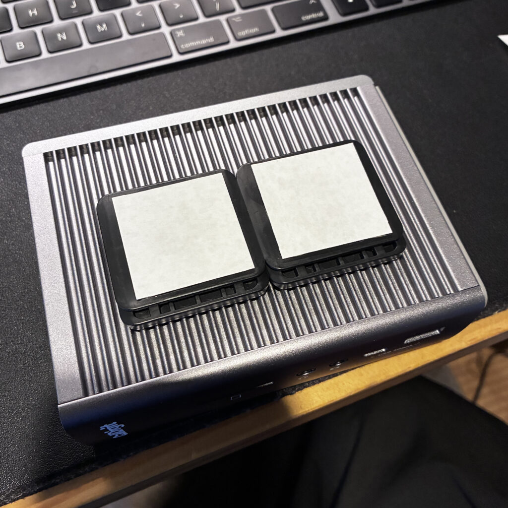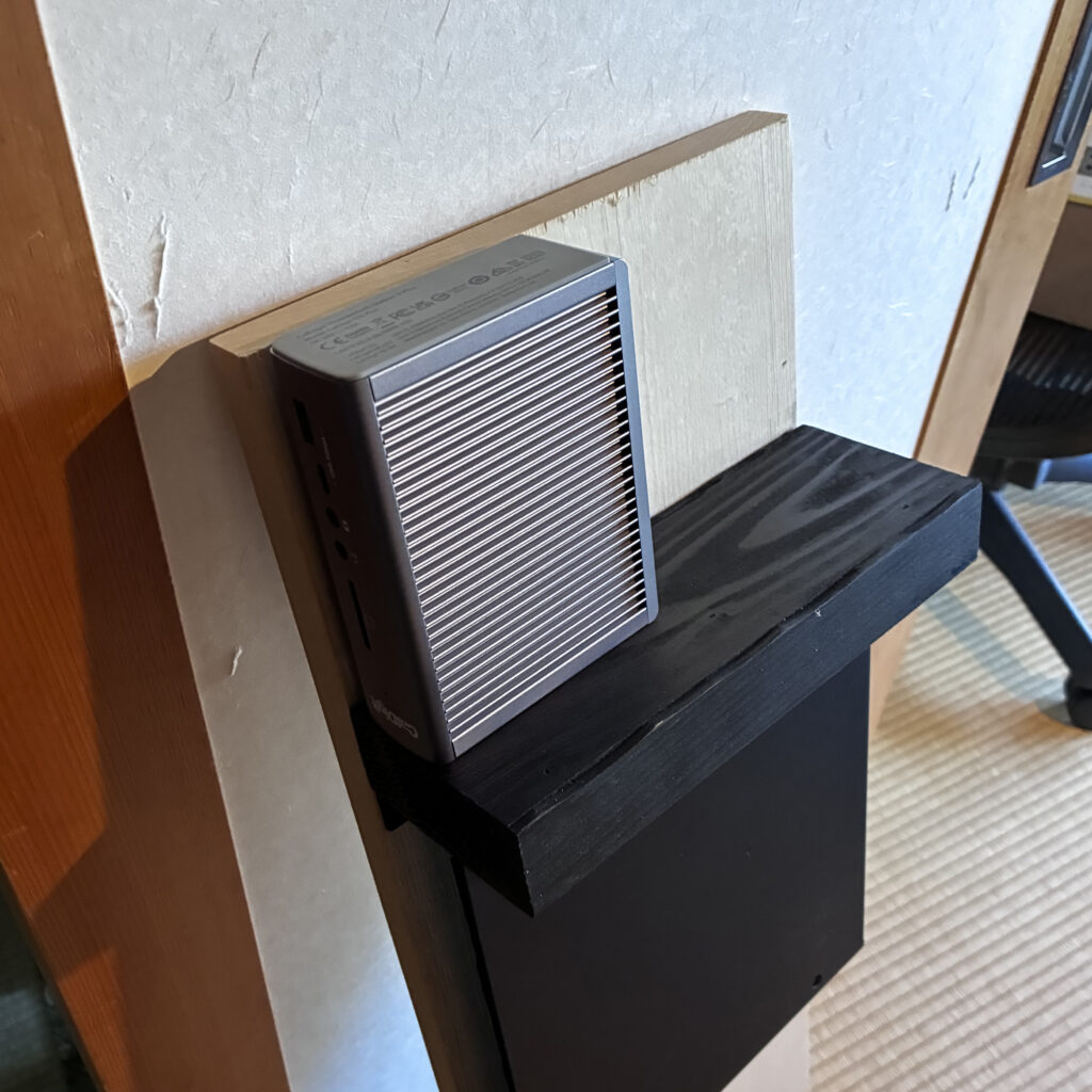 北海道から発送されたので3日ぐらいかけて到着。この商品は縦置き、横置きともに対応しているのですが、ケーブル類を刺したり、SDカードを入れたりするには固定していた方が楽なので、デスクシェルフに取り付けしてみます。