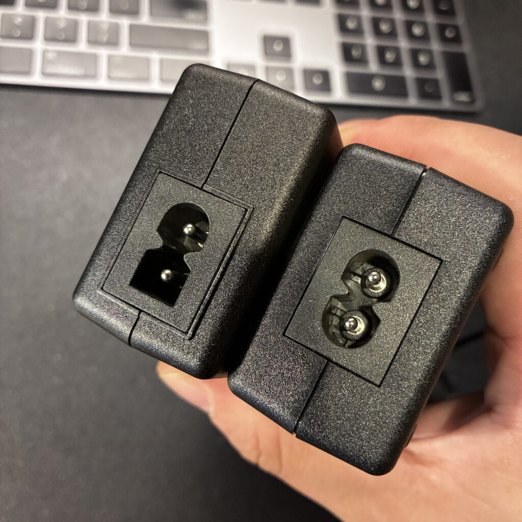 コンセント側のケーブルは以前のものを流用しましたが、差し込み口の形状が少し違いました。そのため反対にも刺すことができ、その場合は通電しないので注意が必要です。通電しなくて焦った…